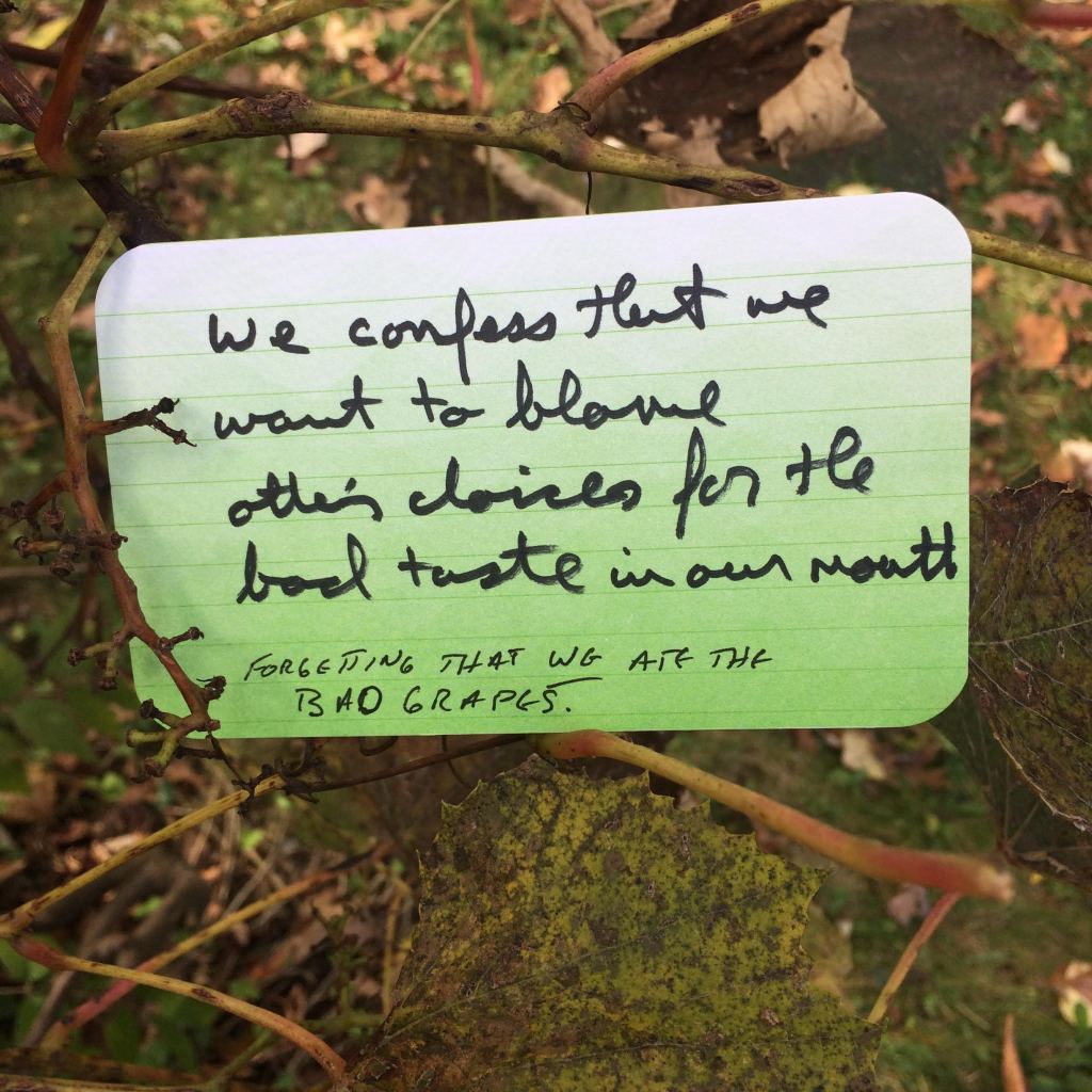 We confess that we want to blame other’s choices for the sour taste in our mouths, forgetting that we ate the bad grapes, acted on the bad advice, followed the destructive but comfortable path.