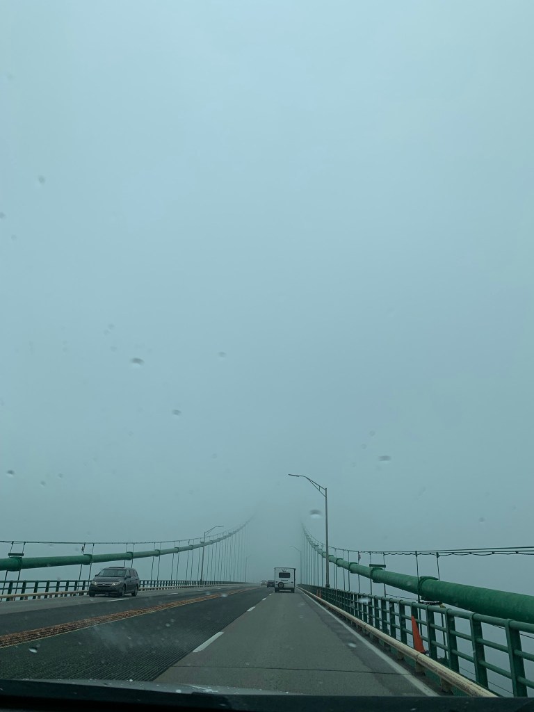 The Mackinac Bridge is about five miles long. The two towers extend 550 feet above the water level. It is safe to drive on. But if there is fog in the Straits of Mackinac, the towers disappear, and the roadway is gone.
