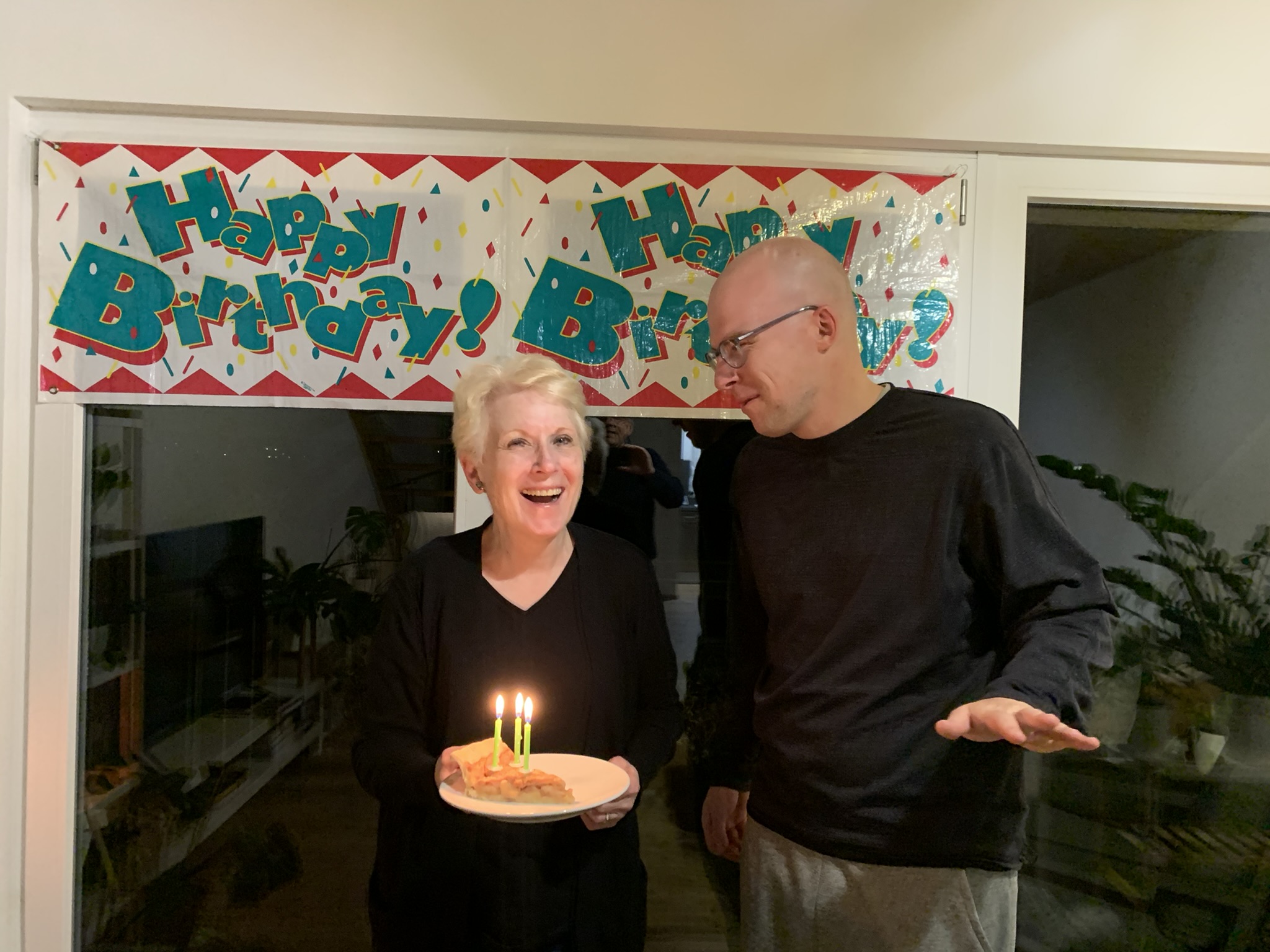 The delightful thing for me about this picture, in addition to watching the laughter of two people I love, is that it gives me a picture of Andrew with his mom to post for his thirty-sixth birthday, which is tomorrow. He’s in that room. We’re not.