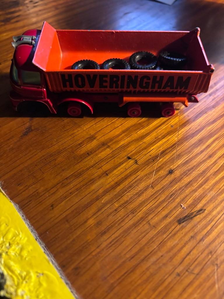 And then he wanted to see “that”. The orange thing. And I got down the small truck my dad brought home from a trip decades ago, the one that was broken when I got it, the one with the tiny plastic tires that have come off the wheels for the same decades.